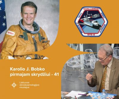 Nuotraukoje: muziejinės vertybės fotoatvirukas (Astronautas Karol J. Bobko, 1980 m.) ir kosminės misijos „CHALLENGER/ STS-6“ emblema bei nuotrauka iš 2015 astronauto vizito muziejuje.