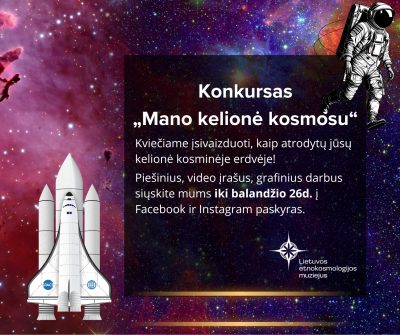 Kviečiame įvairiomis formomis (piešiniais, vaizdo įrašais, grafikos darbais) įsivaizduoti save keliaujant kosmoso erdve ir sukurtus darbus siųsti mums iki balandžio 26 d. į muziejaus Facebook arba Instagram paskyrą (siųsdami darbus sutinkate, kad jie bus viešinami).