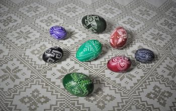 Nuotraukoje matoma muziejinės vertybės – margučiai (skutinėti, autorė R. Juodvalkytė). Audėklas – lovatiesė (audėja E. Patiejūnaitė). Saugomos Lietuvos etnokosmologijos muziejaus fonduose