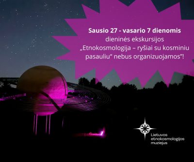 ❗Dėmesio! Sausio 27 – vasario 7 dienomis dieninės ekskursijos „Etnokosmologija – ryšiai su kosminiu pasauliu“ nebus organizuojamos dėl techninių ekspozicijos atnaujinimo darbų.
