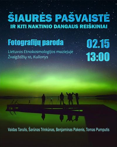 Lietuvos etnokosmologijos muziejus kviečia į parodos „Šiaurės pašvaistė ir kiti naktinio dangaus reiškiniai“ atidarymą apžvalgos aikštelėje vasario 15 d. 13 val. Atidarymo metu parodos autoriai pristatys fotografavimo proceso įspūdžius taip pat pasidalins įspūdingiausių kadrų istorijomis.
