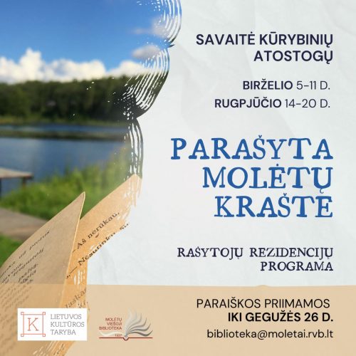 Rašytojų rezidencijų programa „Parašyta Molėtų krašte“ vyks birželio 5 – 11 ir rugpjūčio 14 – 20 dienomis. Programa suteikia galimybę savaitę plėtoti būtent tą knygą ar kūrybinį projektą, kuris Jums dabar aktualiausias. Rezidencijos metu galėsite rinkti medžiagą, į ją gilintis, rašyti, perrašyti ar pradėti kurti iš naujo. Daugiau informacijos: https://moletai.rvb.lt/2023/04/25/kvieciame-rasytojus-i-rezidencija-moletu-kraste/